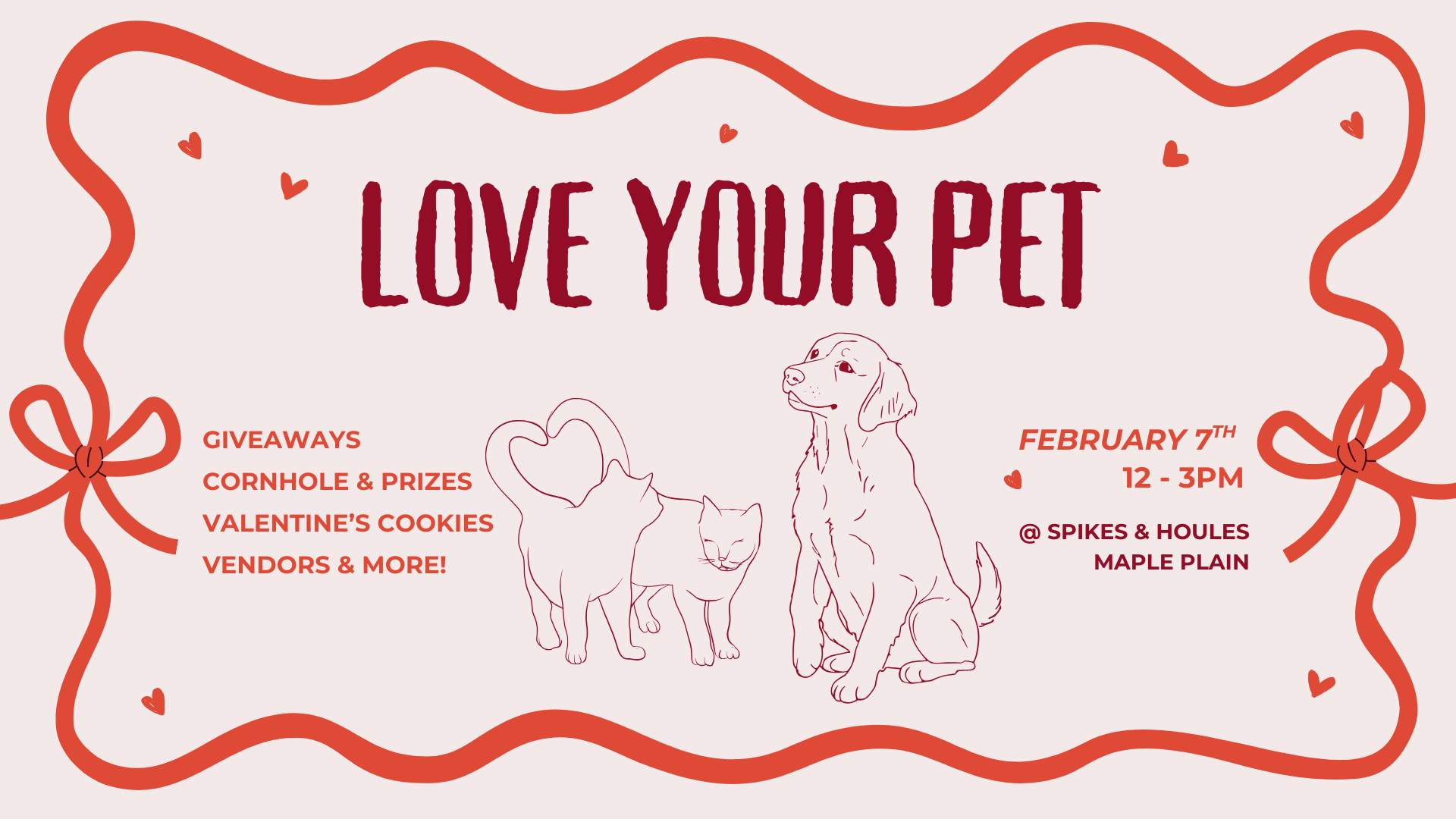 Join us for a Valentine event all about loving your pets! Enjoy giveaways, corn hole games (& prizes), valentine’s cookies, vendors and more!