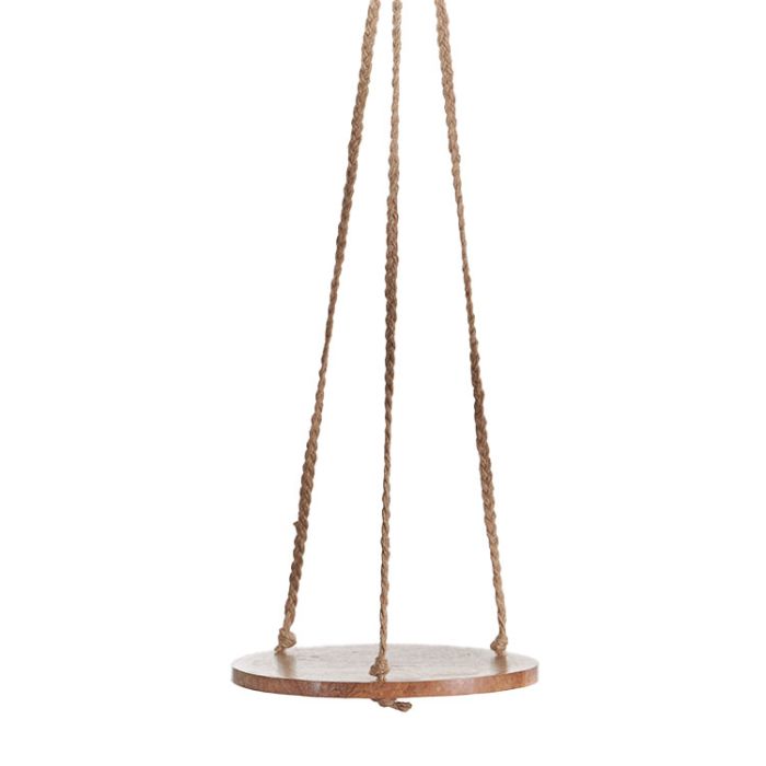 Primitive Planters 10" Hanging Wooden Round is a 10" mango wood round stained brown. This has a 30" jute hanger attached. Use to display a small potted plant, battery operated candle, or your favorite Knick knack. Use with Primitive Planters S Hooks or Hanger Hooks for easy hanging. (pots, plant, accessories not included)