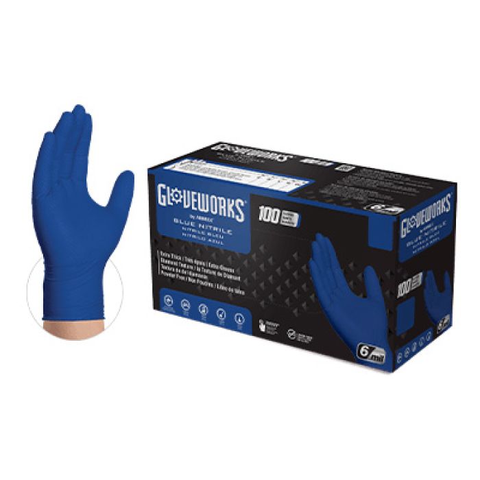 Gloveworks Industrial Royal Blue Nitrile Gloves stand up to the toughest jobs. They feature raised diamond texture (RDT) which creates 60% more surface area for an exceptional liquid channeling grip. RDT provides a comfortable fit: fewer contact points with the skin increase airflow and reduce sweating vs. non-textured gloves.