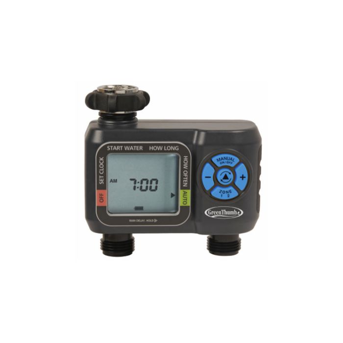 Green Thumb 2 Zone Watering Timer, Easy Set up, Can Water Up To 24 Hours A Day, Watering Duration from 1 To 360 Minutes, Manual Watering Control And Rain Delay Option, Large LCD Screen, Battery Indicator Displays When Batteries Are Low, Requires 2 AA Batteries.