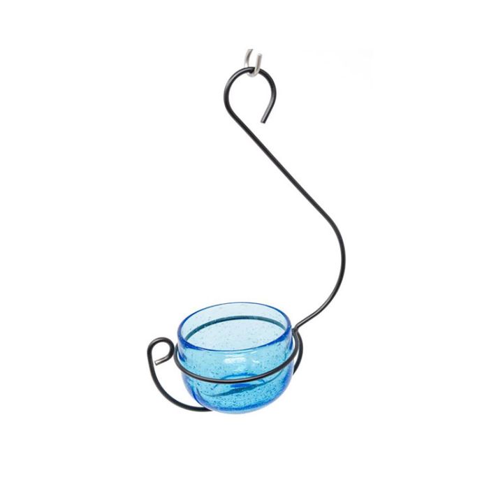 This adorable feeder is perfect as a mealworm feeder, jelly or suet pellet container. It will attract many songbirds including Bluebirds, Orioles, Juncos, and many more depending on your location and season. Elegantly curved metal hanger and built-in perching space so your feathered friends can comfortably enjoy their treats. Hang this feeder on a branch or deck to give local birds a nutritious and delicious snack. Easily remove the glass dish for seamless cleaning.