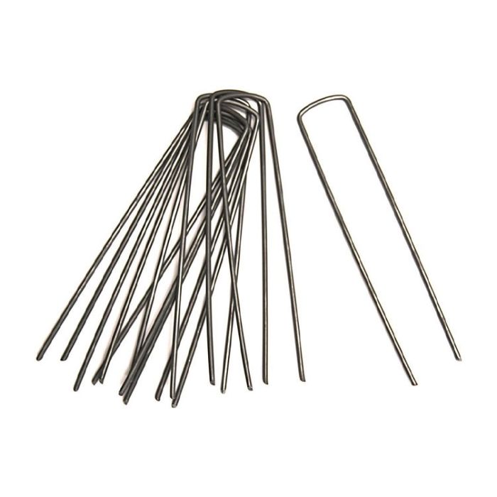 Use to anchor landscape fabric, soaker hoses, drip hoses, netting, turf and burlap Durable steel construction; For securing heavier commercial grade landscape fabrics Anchor a range of gardening objects including fabric, netting, outdoor lighting, and garden decor U shaped garden staples; Available in bulk for commercial applications