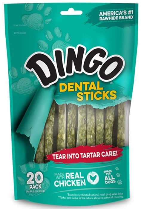 Protect your pooch’s pearly whites. Help fight stubborn plaque and tartar buildup with Dingo® Dental Sticks, For Tartar Control. These yummy treats offer the same great taste as other Dingo products made with real chicken in the middle, for a great source of protein. Your dog is sure to love the taste of real chicken, and you’ll love their sparkling, clean teeth.