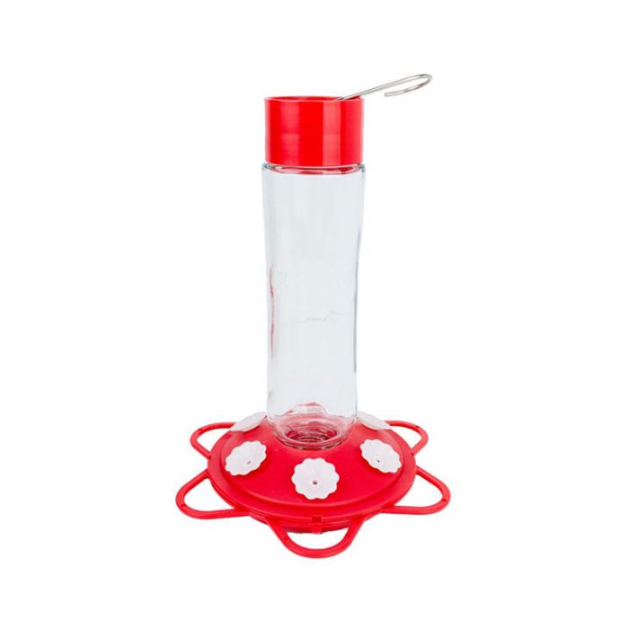This feeder utilizes six integrated perch feeding stations to ensure there's enough room for multiple birds to feed simultaneously. Nectar feeders contribute to the well-being of hummingbirds while offering a delightful way for bird enthusiasts to enjoy nature. With a 20 ounce nectar capacity, this feeder keeps your hummingbirds happy and coming back for more. Included hook at top of feeder allows for easy hanging.