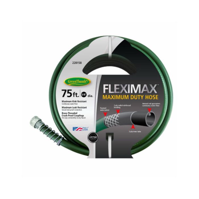 Green Thumb, 5/8", Max Duty, FLEXIMAX Hose, Durable Construction, Dependable, High Quality, Long Life, Easy Handling & Easy Grip, Heavy Duty Crush-Proof Hex Couplings, Foamed Outer Jacket, 2-Ply Radial Reinforced Braiding, 2-Ply Inner Tube, Internal Rod Guarantees Continuous Water Flow, Lifetime Warranty.
