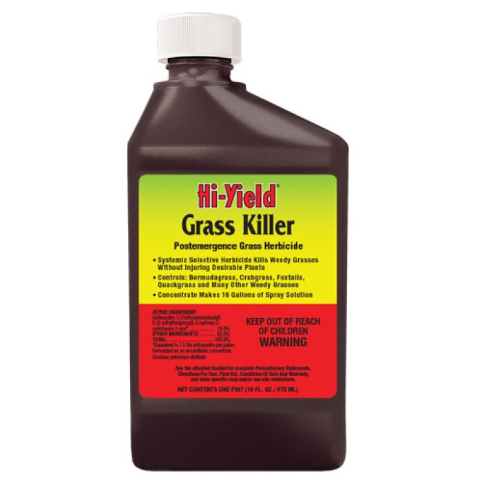 Systemic selective broad spectrum post-emergent herbicide that can be sprayed over desired plants listed to control annual and perennial grasses. Stops growth of weed grasses within 2 days. Can be used on vegetables, gardens, trees, shrubs, ornamentals and ground covers. Dilution Rate: 2 tablespoons per gallon of water to cover 1,800 sq. ft. For best results, add 2 teaspoons per gallon water of Spreader Sticker. Works better with Hi-Yield® Spreader Sticker. Always Read and Follow Label Directions.