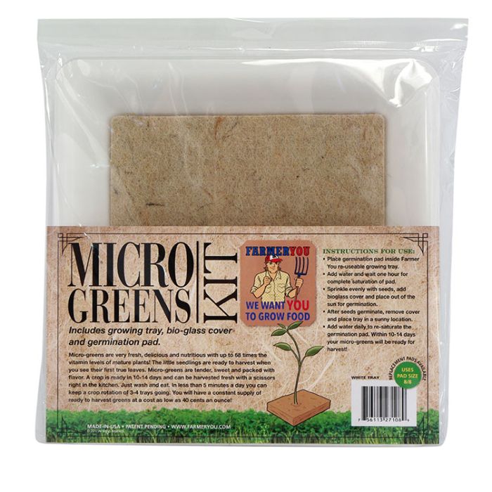 This Farmer you™ Micro-Green Kitchen grow kit is used by professionals and home cooks because they are a 100% natural fiber pad, easy to grow, and produce nutrient dense greens at an amazing price per ounce. Everyone enjoys these easy germination pads and their lack of “dirt”! Pads are discarded after use and fresh pads are purchased. Grow your own microgreens at home in the Farmer You Microgreen Kitchen Kit