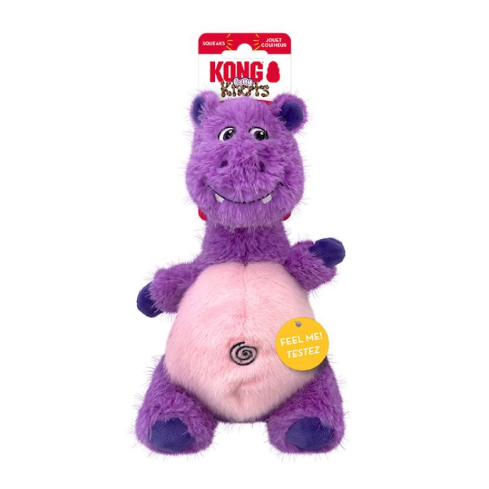 KONG Knots Belly Hippo is soft and cuddly on the outside with a strong, durable rope ball on the inside making its belly round and weighty. This dense internal skeleton rope ball adds heft and movement that entices instinctual thrashing, flinging, and light chewing. A squeaker in this purple hippoās head piques dogsā interest and adds excitement to play sessions.