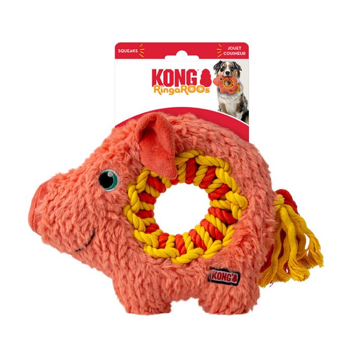 KONG Ringaroos bring tough and plush fun to daily playtime. Featuring a robust rope ring surrounded by a soft, comforting pal, Ringaroos are the ideal shape and size for toss-and-carry play sessions. Multiple textures entice fetching, biting, tugging, and snuggling when playtime is over. A squeaker inside this plush palās head engages instincts and prolongs play.