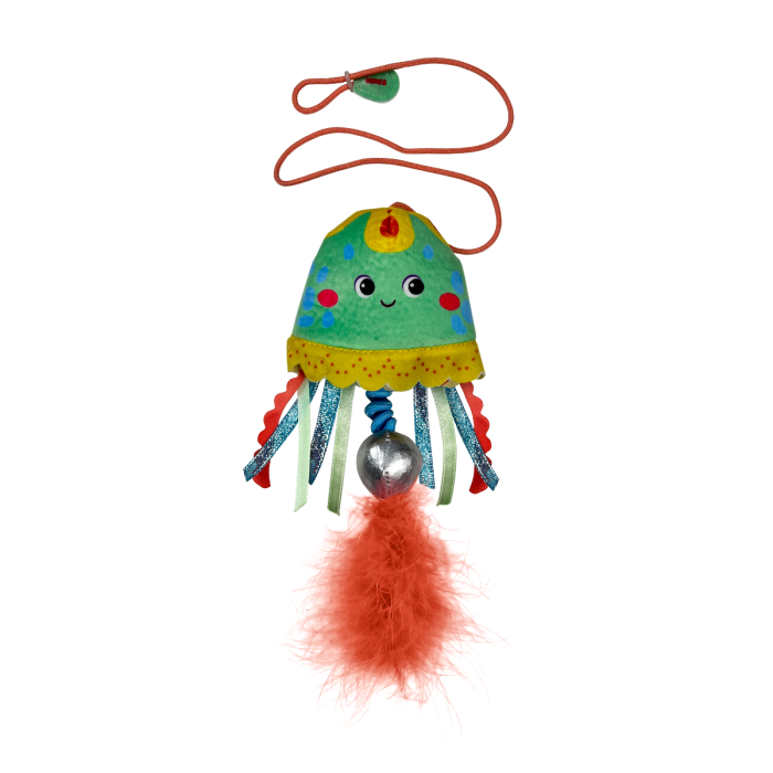 KONG Jellyfish Teaser’s a multi-sensory bundle of instinct-satisfying play that attaches to a finger for interactive adventures—or a doorknob or handle for solo “undersea” exploits. Ball and feather bounce on elastic cord, inviting capture while irresistibly dangling ribbon tentacles entice batting. Bell, crinkle and KONG North American Premium Catnip prolong play.