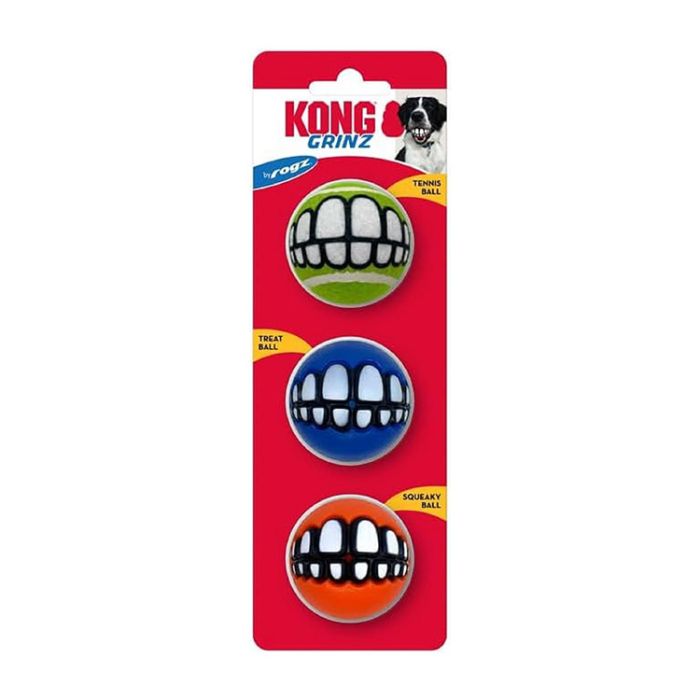 KONG Grinz Variety 3-pack offers three styles of play- one squeaky, one tennis, and one treat ball. Each durable ball has a unique texture and all of them offer dynamic bounce for action-packed rebounds. Each ball comes with the classic Grinz teeth.