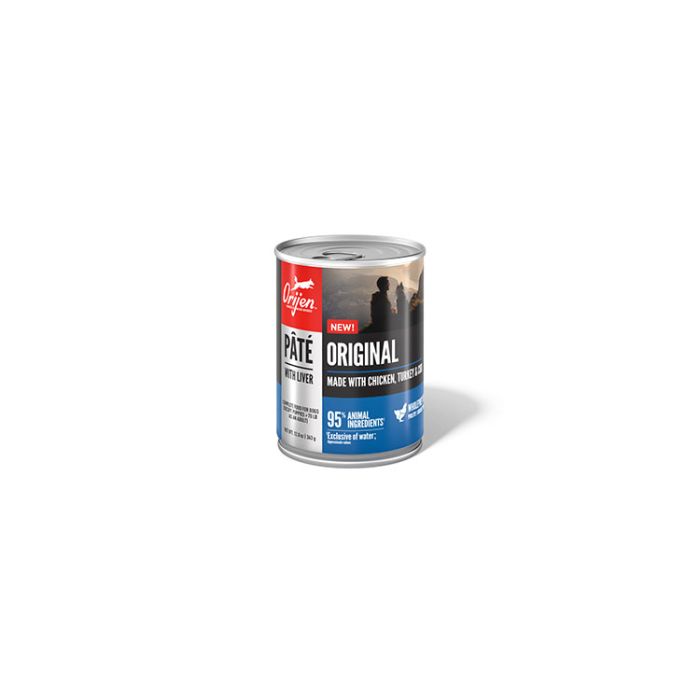 ot all wet dog foods are created equal, and this pâté provides your dog with the nourishing animal ingredients they need to truly thrive! Nourish your dog with the WholePrey animal ingredients packed into every can of smooth, nutrient-dense ORIJEN Pâté with Liver. Our Original recipe is made with protein-rich chicken, turkey and cod to satisfy your dog with its hearty texture and flavor. WholePrey ingredients mean we also included succulent organs including chicken and turkey liver to provide your dog with delicious flavor and rich nutrients. Plus, savory chicken and turkey bone broths provide your dog with extra hydration.