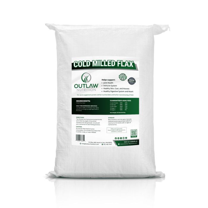 Outlaw Nutrition's naturally stabilized Cold Milled Flax is a highly digestible, all-natural plant-based powerhouse of protein, fiber, and essential fatty acids (EFAs)—particularly Omega-3, with over three times more than Omega-6. Mimicking the benefits of fresh pasture grass, this nutrient-dense ingredient provides EFAs that animals cannot produce on their own, making it an ideal addition to any equine or livestock diet to maintain healthy Omega-3 levels. Incorporating Cold Milled Flax may support a shiny coat and healthy skin, bolster immune function, promote joint and muscle health, and aid digestion, leading to overall vitality and well-being when used correctly.