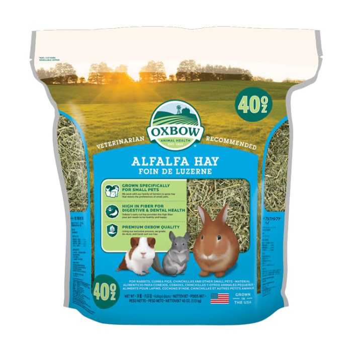 Sweet, soft Oxbow Alfalfa Hay is a legume hay high in fiber, protein, and digestible energy. Alfalfa hay is the ideal hay for growing, pregnant, or nursing pets. Or, offer to your rabbit, chinchilla, guinea pig, or other small pet as a treat anytime.