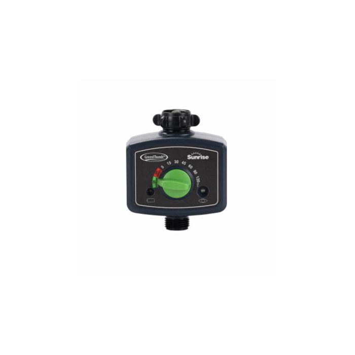 Green Thumb Photo Sensor Watering Timer, Just Turn The Dial To The Desired Duration And Timer Will Come On At Dawn Every Day, No Programming Required, Manual On Feature, Requires 2 AA Batteries.