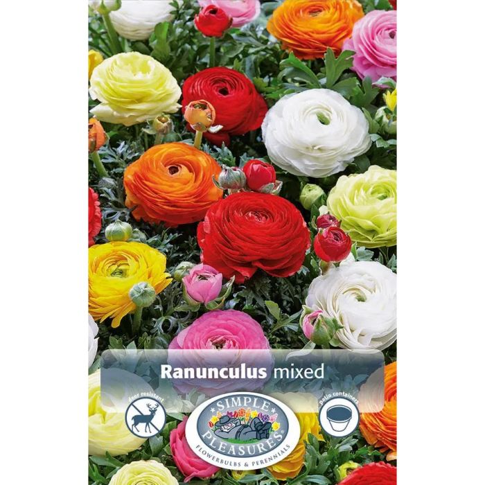 Ranunculus Mixed performs best in full sun to partial shade locations with well-drained soil. Plant corms 1-2 inches deep and 4-6 inches apart in spring for zones 3-7, where they're grown as annuals. In zones 8-10, fall planting is possible. For northern climates, greenhouse fall planting is recommended as they won't survive winter outdoors in zones 4-7. Size 8/+ corms ensure robust plants with abundant blooms from late spring through early summer.More Information