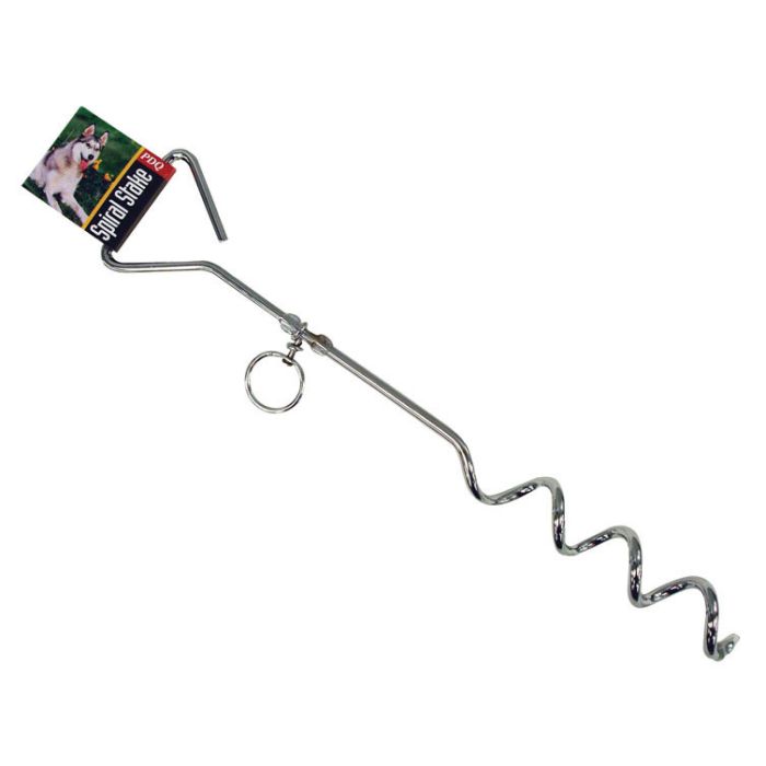 Bosspet 18 " Spiral Tie-Out Stake. Twist-in stake. 360 degree of roaming freedom. Designed with durability for outdoor use. Two way swivel and ring allow for 360 degree movement.