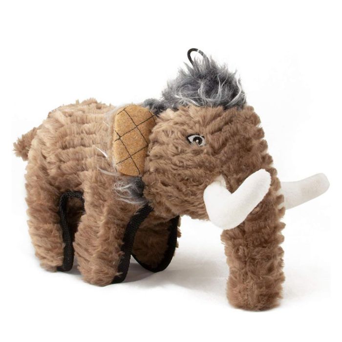 Woolly mammoth premium "Ruffian" dog toy. This adorable and realistic toy is well made with a soft but tough plush, is crinkle-lined with squeaker, and has embroidered for safety facial features. Sure to be one of your pup's favorite buddies. Featuring "steel shield" technology - a durable, puncture resistant fiber sewn into it, and has thick nylon trim/edges. Unlike other plush toys, it should take a whole lot for your dog to tear into this one... and IF so, there is a surprise tennis ball inside!! Measures approximately 11".
