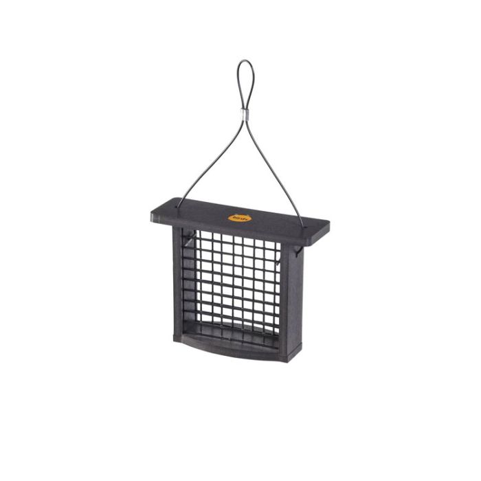 This attractive, navy peony single cake suet feeder is a maintenance-free durable bird feeder constructed with recycled poly lumber material. It is easy to care for and easy to clean. Simple hanging loop given. Removable vinyl coated suet panels/screens. Stainless steel fasteners for extra durability.