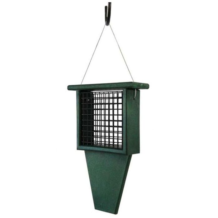 Hunter Green Recycled Plastic Suet Feeder with tail prop for the woodpeckers to balance with their tail. Holds standard size suet or seed cakes and is easy to clean and disinfect. 7.5 x 2.5 x 11.25