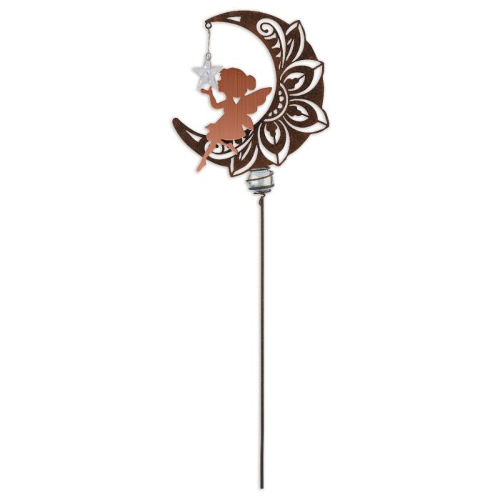This garden classic features a pixie fairy sitting in the crest of the moon while gazing at the dangling star. The dangling star will shimmer in the sunlight. Made with durable laser cut metal. Measures approximately: 5.71" x 0.79" x 17.91"
