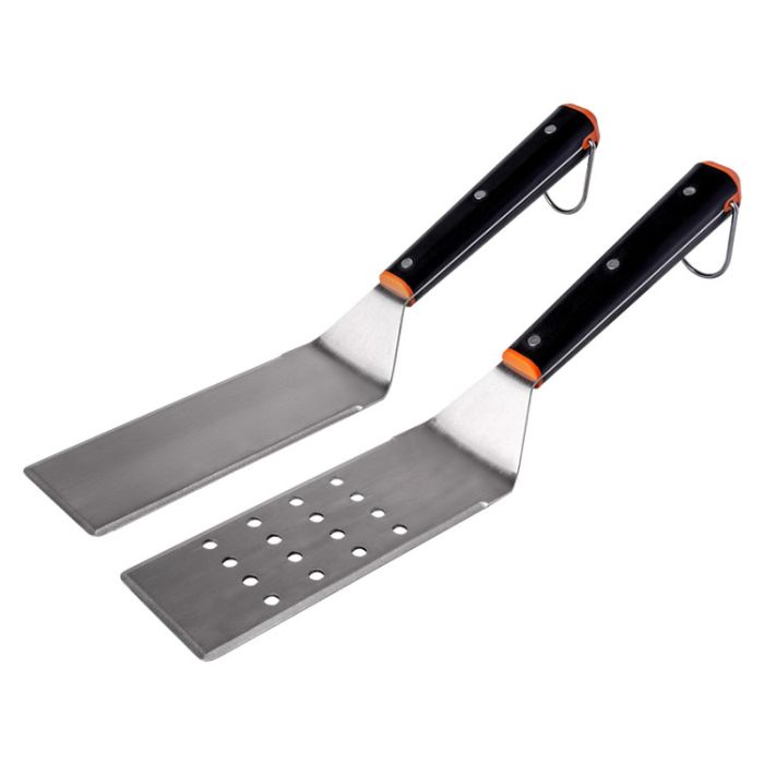 Griddle like a pro with the Traeger Flat Top Spatula 2-Pack. The set features two spatulas—one solid spatula for scooping, flipping, and pressing down for the ultimate sear—and one slotted spatula for lifting and serving juicier dishes. They’re both made from heavy-duty stainless steel that can stand up to heavy lifting and high temps and are both dishwasher-safe for quick and easy cleaning.