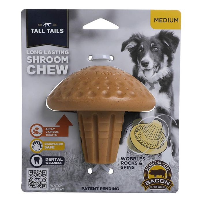Taste the fun with Tall Tail's Shroom Chew Dog Toy! Wobbles, rocks, and spins for some tail-waggin' fun, they are sure to have hours of fun with its long-lasting bacon scent and textured surface. With an easy shape to hold, this toy is ideal for dogs who love to chew and chomp. Add yummy spreadable treats for even more fun!