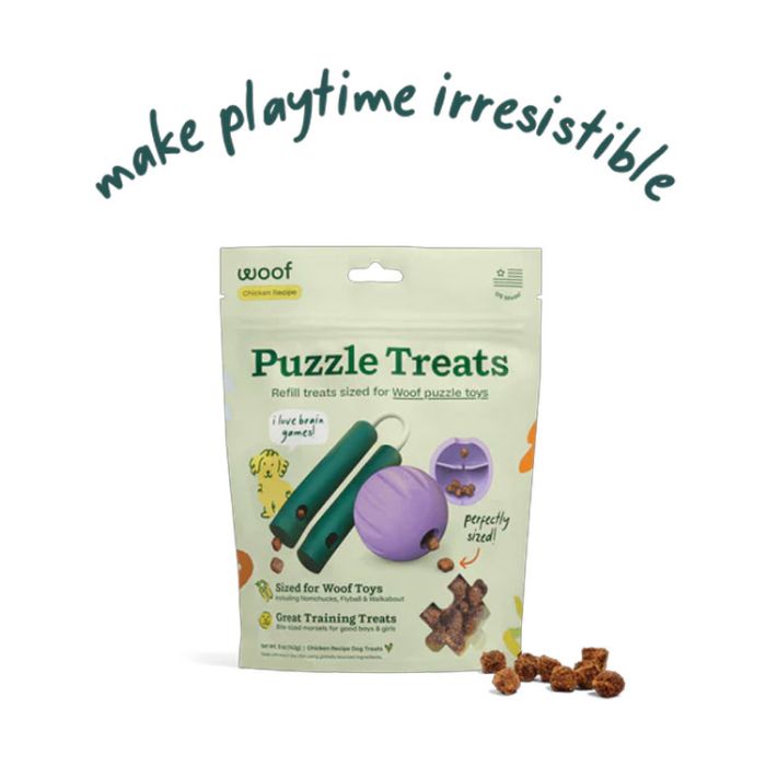 Meet the treat made for longer play. Perfectly sized for Woof puzzle toys, Puzzle Treats turn everyday fun into a tasty, brain-boosting challenge. Crafted with real chicken and brown rice, these protein-rich rewards are air-dried to lock in drool-worthy flavor (and irresistible aroma). Designed to fit Nomchucks, Walkabout, Flyball, and other puzzle or treat dispensing toys.